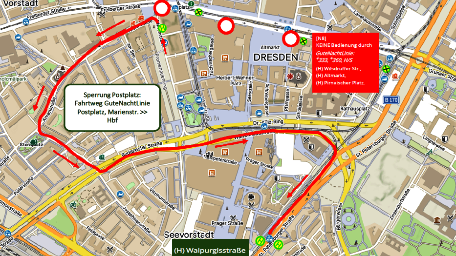 Als Ersatz nutzen Sie bitte die Haltestellen Walpurgisstraße oder in der Marienstraße.