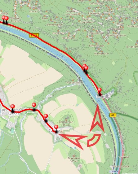 Zwischen den Endpunkten der Linie 252, Schöna und Schmilka, liegen 1,5 Kilometer Luftlinie aber auch die Kaiserkrone, die Elbtalbahn und die Elbe.