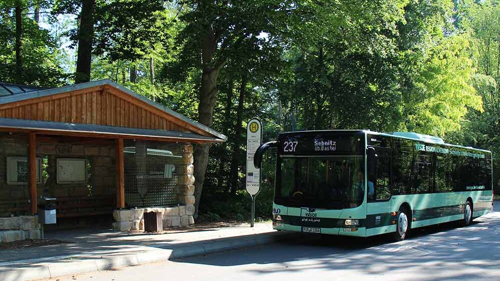 Von Pirna oder Sebnitz bringen Sie die Busse der "Bastei-Linie" 237 täglich bis zur Bastei.