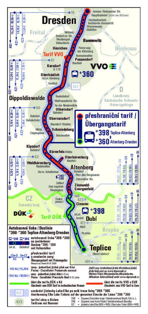 Auf unserer 398 gelten die Tarife des VVO (D) und des DUK (CZ) in ihrer jeweiligen räumlichen Gültigkeit. Zwischen beiden Verbünden gilt ein Übergangstarif. Fahrgäste in Deutschland zahlen in Euro und Fahrgäste in Tschechien zahlen in Kronen.